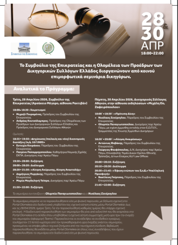 Πέμπτη, 30 Απριλίου 2026, Δικηγορικός Σύλλογος Αθηνών, στην αίθουσα εκδηλώσεων «Μιχάλη Επ. Ζαφειρόπουλου»